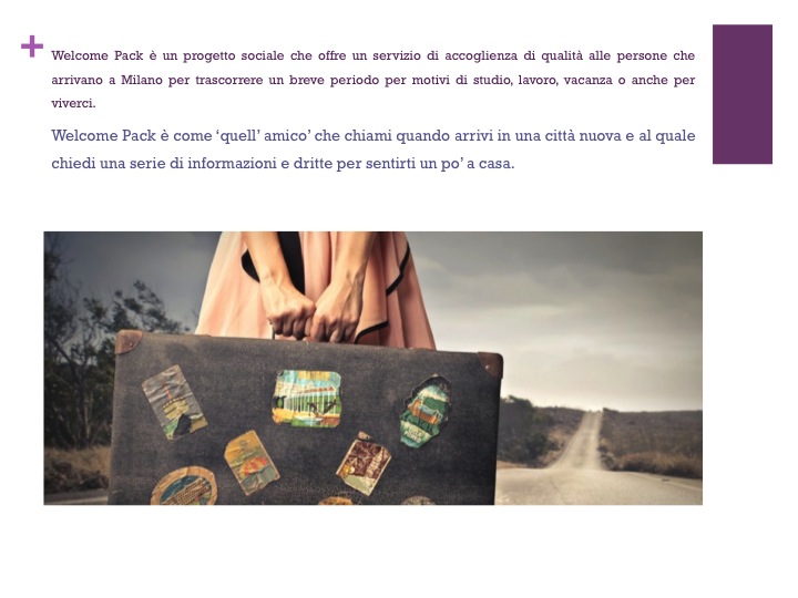 Welcome Pack è un progetto sociale che offre un servizio di accoglienza di qualità alle persone che arrivano a Milano per trascorrere un breve periodo per motivi di studio, lavoro, vacanza o anche per viverci.